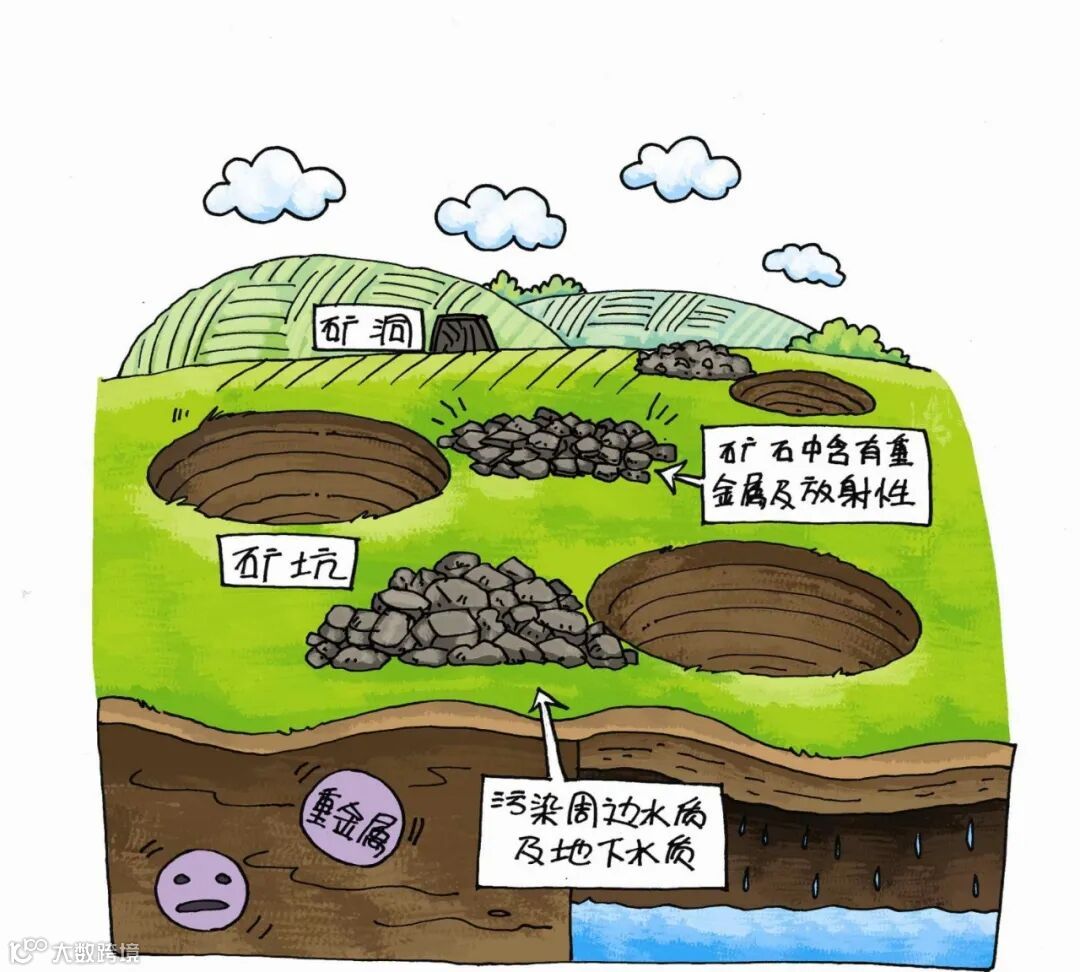 矿山固体废物是在采矿和选矿过程中产生的没有工业价值的矿物,例如尾矿、废石以及煤矸石等。这些废物通常都含有重金属等污染物。另外,还会有选矿过程加入的一些表面活性剂、酸或者碱等危害环境的成分。有些矿山固体废物还有一定的放射性。它们通常会堆在矿场附近,既侵占良田,又在长期的风化及雨水的淋洗下,使周边的地下水质变坏,特别是酸性水或含有重金属的污水,污染周边环境。