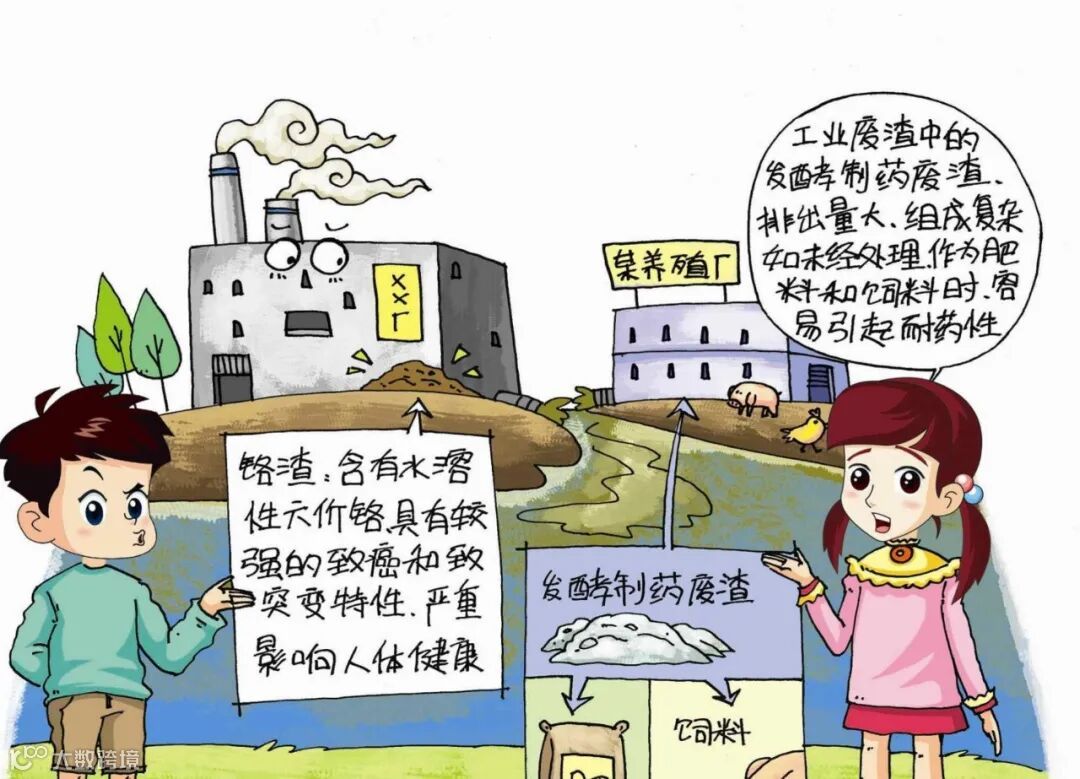 例如,工业废渣中的铬渣,含有水溶性六价铬具有较强的致癌和致突变特性。铬渣露天堆放,受雨雪淋浸,所含的六价铬就会被溶出渗入地下水或进入河流、湖泊中污染环境,容易造成更大规模的危害。再如,工业废渣中的发酵制药废渣,排出量大,组成复杂,涉及的有毒有害物质种类多,在未经处理的情况下,会对环境造成新的污染。特别是当发酵制药废渣作为动物饲料和肥料时,容易引起耐药性问题,存在各种安全隐患。