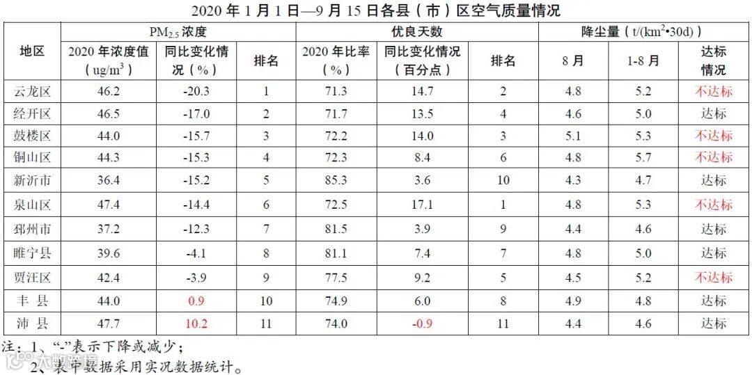 从优良天数看,除沛县同比下降外,其余均同比上升。