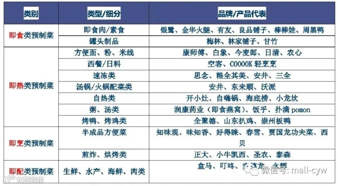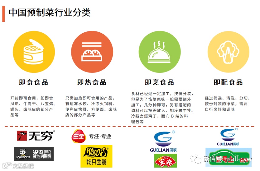 即食食品是指开封后可直接食用的食品,如八宝粥、烤鸡等; 即热食品是指简易加热即可食用的食品,如包装好的佛跳墙、汤类罐头等; 即烹食品是指经过相对深加工,按份分装冷藏或常温保存的半成品材料,可以立即入锅,加上调味品即可食用的食品,如冷藏牛排、冷藏馒头等;即配食品(净菜)是指经过清洗、分切等初步加工,按份封装的净菜等,需要自己动手炒制。