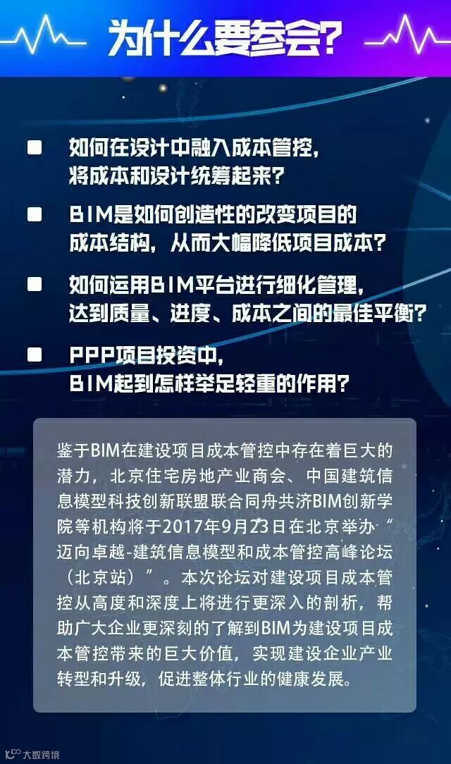 鉴于BIM在建设项目成本管控中存在着巨大的潜力,北京住宅房地产业商会、中国建筑信息模型科技创新联盟联合同舟共济BIM创新学院等机构将于2017年9月23日在北京举办“迈向卓越-建筑信息模型和成本管控高峰论坛(北京站)”。本次论坛对建设项目成本管控从高度和深度上将进行更深入的剖析,帮助广大企业更深刻的了解到BIM为建设项目成本管控带来的巨大价值,实现建设企业产业转型和升级,促进整体行业的健康发展。