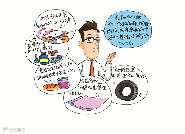 其他行业如:烟草行业、纺织品行业、玩具行业、家具装饰材料、汽车配件材料、电子电气行业以及洗涤剂、清洁剂、衣物柔顺剂、化妆品、办公用品、壁纸及其他装饰品、农药、橡胶、精细化工等行业均会产生VOCs。