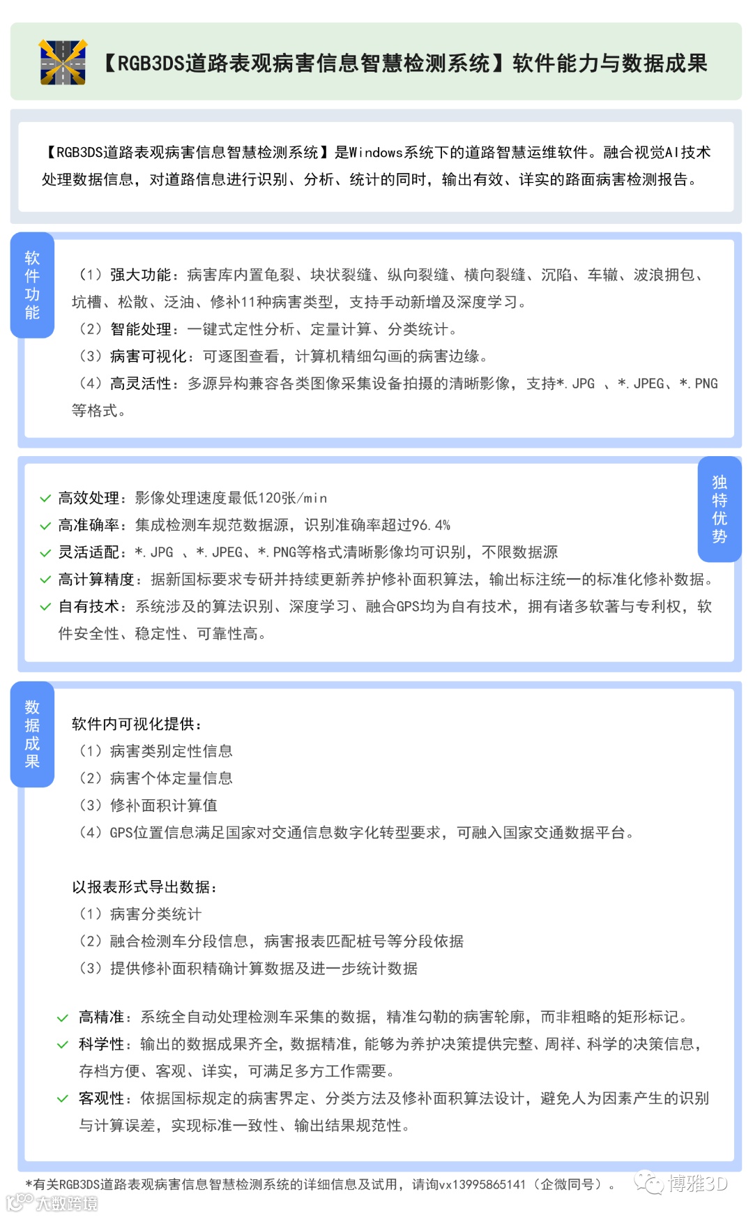 【RGB3DS道路表观病害信息智慧检测系统】融合视觉AI技术处理数据信息,对道路信息进行识别、分析、统计的同时,输出有效、详实的路面病害检测报告。