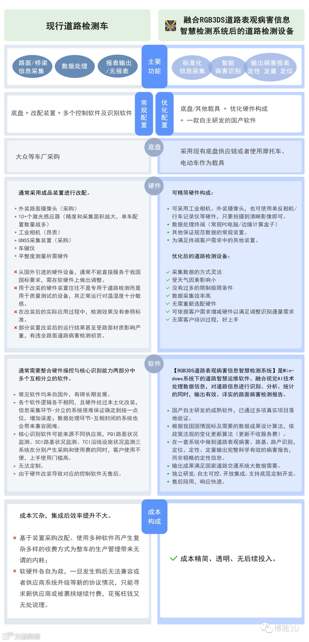 从国外购买道路检测车成本高昂,加之系统对可采集的车道宽度与车速等限定条件与我国道路运行规范不能完美适配,而市场需求又客观存在,本土道路检测车诞生了。从表面上看,采购成本下降一层,却没有真正解决道路检测车的产品内核——通常来说,道路检测车要拥有三大基本功能:路面/桥梁信息采集、数据处理、报表输出。目前,一台道路检测车的常规配置中,改配装置与识别软件大部分依然来自国外采购。没有彻底解决技术壁垒,无疑使国内道路检测车产业的困境。而现在,博雅弘拓科技力推【RGB3DS道路表观病害信息智慧检测系统】道路检测车系统集成预装版本,让国产自主的识别技术赋能道路检测车,突破性实现检测车从软硬缝合到国产一体化的底层升级。