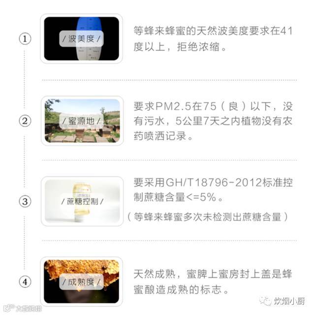 与养蜂人直接建立联系,要求养蜂人严格按照等蜂来的标准进行采蜜,控制生产环节和采蜜条件,只采集波美度(溶液浓度)在40.5°以上的天然成熟蜜,从源头开始监管,保证蜂蜜质量。