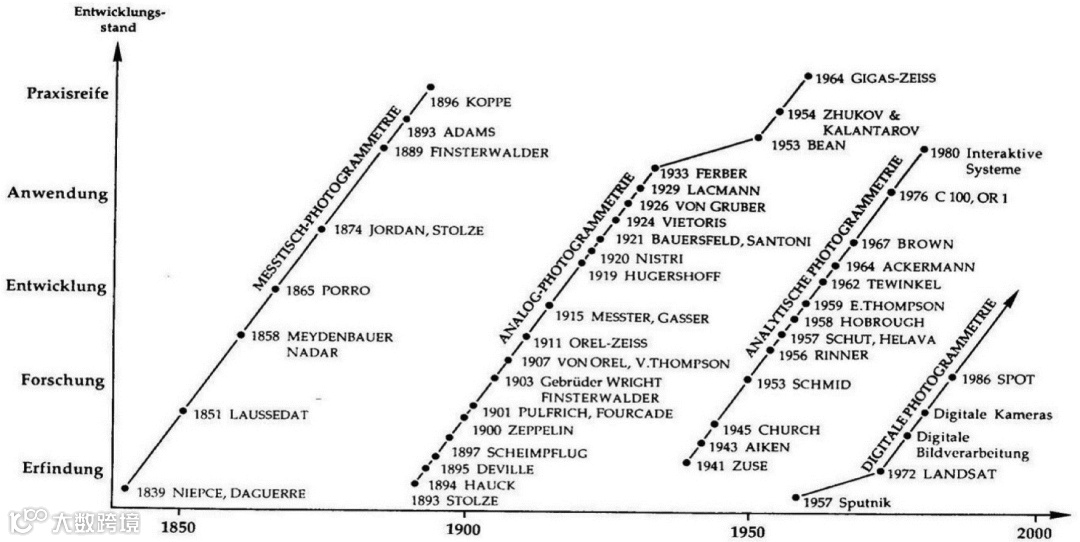 同时,摄影测量学及其底层技术也在发生变化。我们以经济学家N.D. Kondratjew的眼光审视摄影测量学的历史,他在1925年提出了经济学发展的波动理论。据他说,经济以周期性发展,以“30年增长期,20年衰退期,再到30年增长期”的模式循环。新技术的发明可以带来经济的增长期(“需求是发明之母”)。