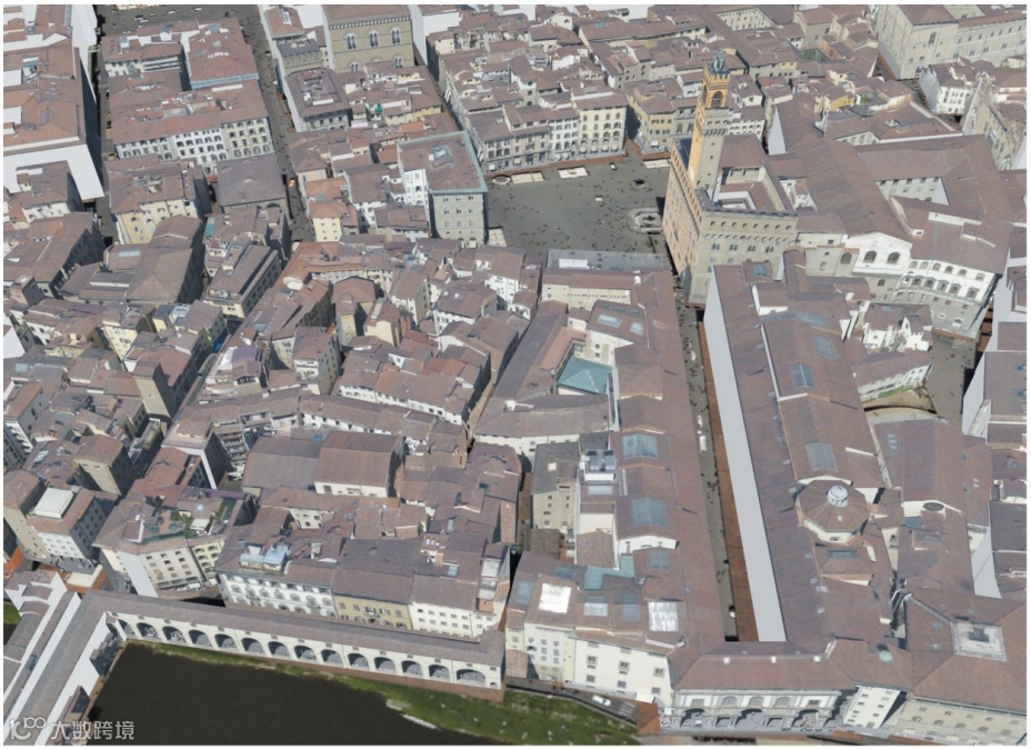 我们提出建筑物和人造物体三维建模方法,并研制了半自动化的建模软件CC-Modeler。首先,操作者要在立体模型中手动测量出弱结构的点云,用以描述目标的关键点。然后,软件CC-Modeler自动将点云转化为能与CAD、可视化和GIS软件兼容的结构化的三维模型。最后,添加纹理到几何模型中生成混合模型。该模型可与DTM集成。图14展示了Firenze市3D模型的一部分。
