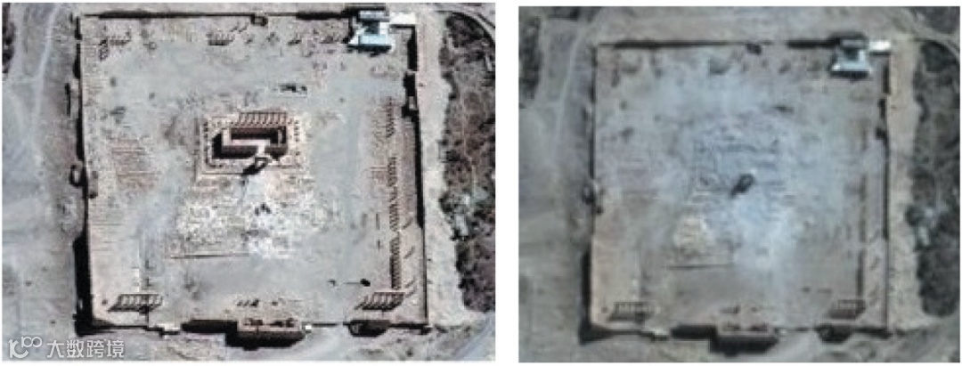最近另一个证明卫星影像价值的例子是巴尔米拉的贝尔神庙的图像,它被ISIS(宗教极端主义组织)破坏,从图18中可以比较破坏前后的样子。