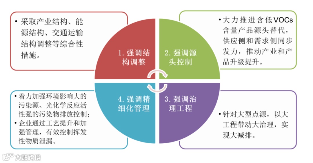 强化VOCs和氮氧化物减排方面有四大侧重:强调产业结构调整,产业结构、能源结构、交通运输结构调整等综合措施;强调源头控制,大力推进含低VOCs含量产品源头替代,推进产业、产品升级提升;强调精细化管理,加强污染物排放控制,提升工艺、加强管理;强调治理工程,以大工程带动大治理实现大减排。
