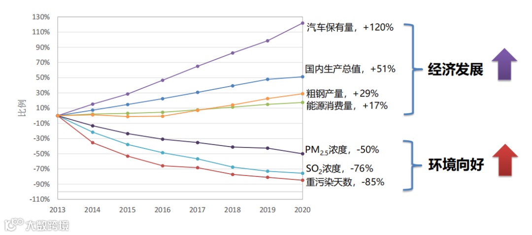 “十三五”期间,我国已经实现大气污染和经济发展“脱钩”。从2013年到2020年,我国汽车保有量增长120%,国内生产总值增长51%,粗钢产量和能源消费量分别增长29%和17%。与此同时,我国生态环境持续向好,PM2.5浓度下降50%,二氧化硫浓度下降76%,重污染天数下降85%。
