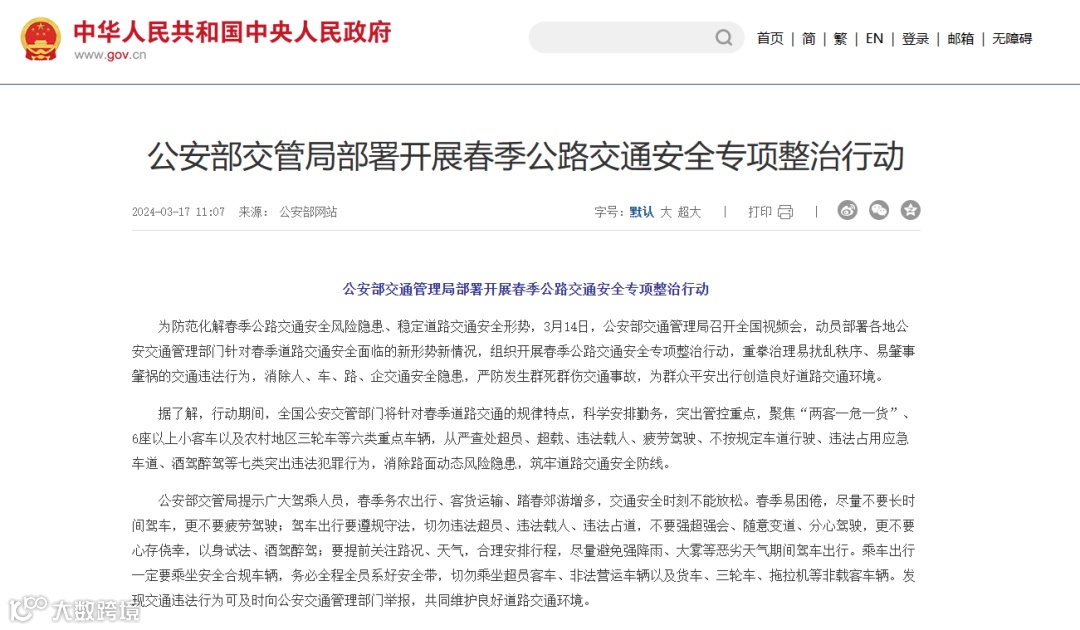 近日,公安部交通管理局召开全国视频会,动员部署各地公安交通管理部门针对春季道路交通安全面临的新形势新情况,组织开展春季公路交通安全专项整治行动。