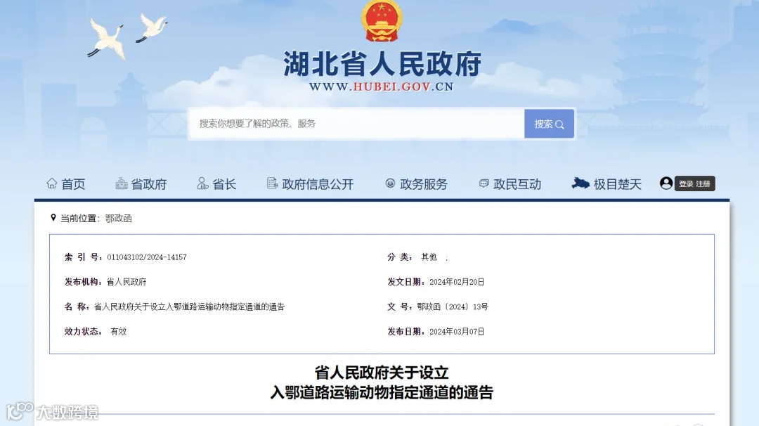 近日,湖北省人民政府网发布《省人民政府关于设立入鄂道路运输动物指定通道的通告》,通知明确全省共设立36条入鄂道路运输动物指定通道,凡经道路运输动物进入(经过)我省的,应当携带《动物检疫合格证明》等国家规定的有效证明和检疫标识,到指定通道接受监督检查(查证、验物、消毒及信息登记追溯等)。检查合格后,方可入鄂。通告自2024年4月1日起实施。