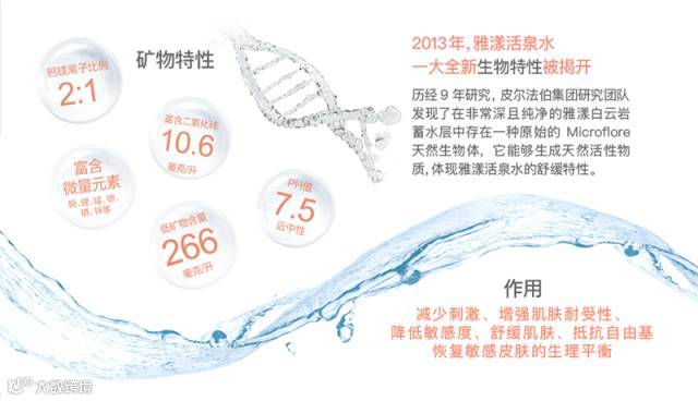 天然泉水 直接从源泉取水,无菌罐装。 纯净无菌,含所需的微量元素和二氧化硅,低矿物含量,喷雾后可在肌肤表面形成舒缓、可透气的保护膜。 增强肌肤耐受性,降低敏感度。适合敏感肌肤及健康肌肤的日常舒缓及补水护肤。