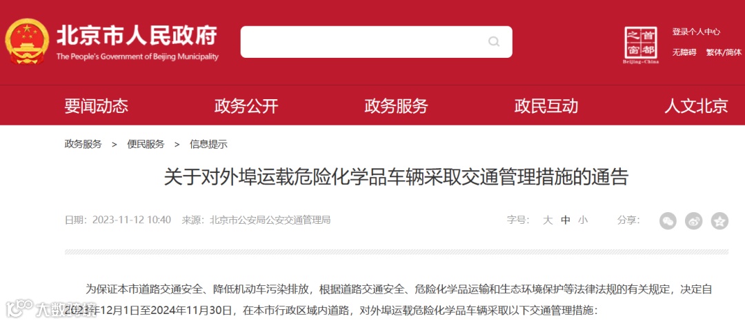 2023年12月1日至2024年11月30日,北京对外埠运载危化品车辆采取交通管理措施。