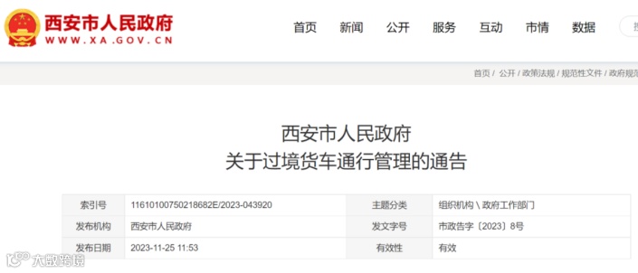 11月25日,西安市人民政府发布《关于过境货车通行管理的通告》(以下简称《通告》)明确自2023年12月1日起至2027年12月31日过境西安的中重型货车(黄色牌照)禁止在西安绕城高速(含)以内区域通行。
