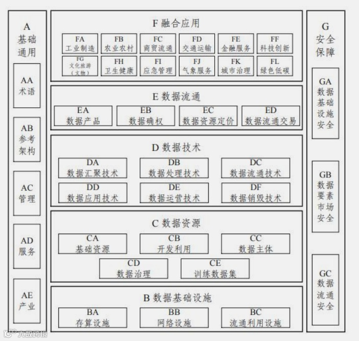 《通知》以数据“供得出、流得动、用得好、保安全”为指引,构建数据标准体系。数据标准体系结构包括A基础通用、B数据基础设施、C数据资源、D数据技术、E数据流通、F融合应用、G安全保障等7个部分,主要反映标准体系各部分的组成关系。数据标准体系结构如图1所示。
