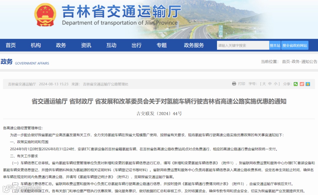 8月12日,吉林省交通运输厅、省财政厅、省发展和改革委员会发布《关于对氢能车辆行驶吉林省高速公路实施优惠的通知》,明确2024年9月1日0时至2026年8月31日24时,安装ETC套装设备的吉林省籍氢能车辆,在吉林省各高速公路收费站间点对点免费通行,相应的高速公路通行费由省财政统一支付。