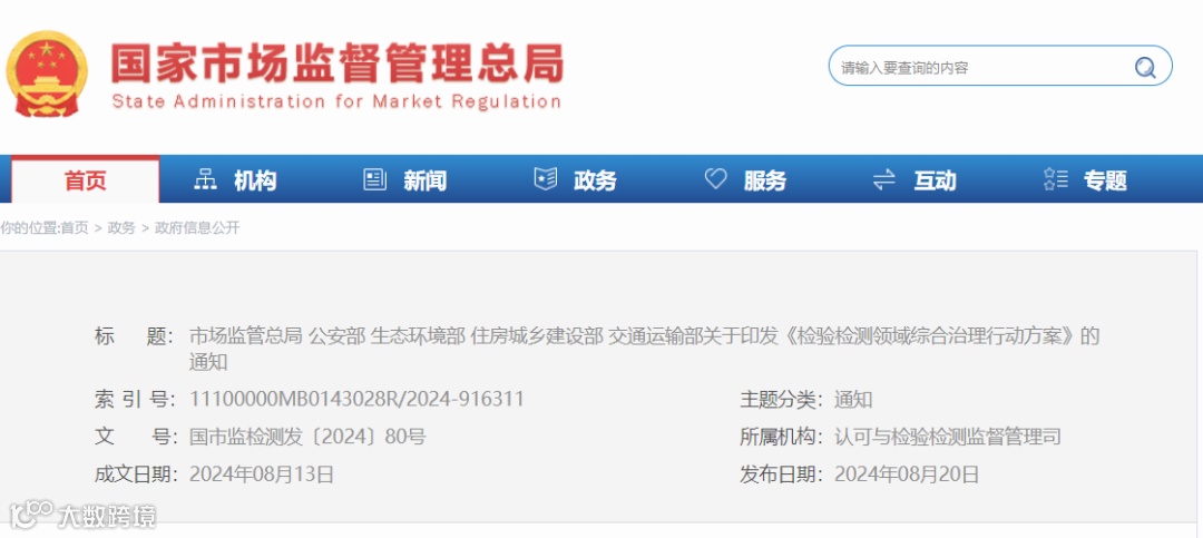 近日,市场监管总局、公安部、住房城乡建设部等5部门印发通知,开展检验检测领域综合治理行动。