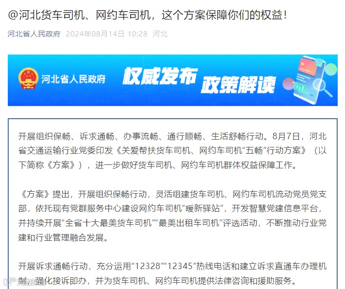 8月7日,河北省交通运输行业党委印发《关爱帮扶货车司机、网约车司机“五畅”行动方案》,进一步做好货车司机、网约车司机群体权益保障工作。