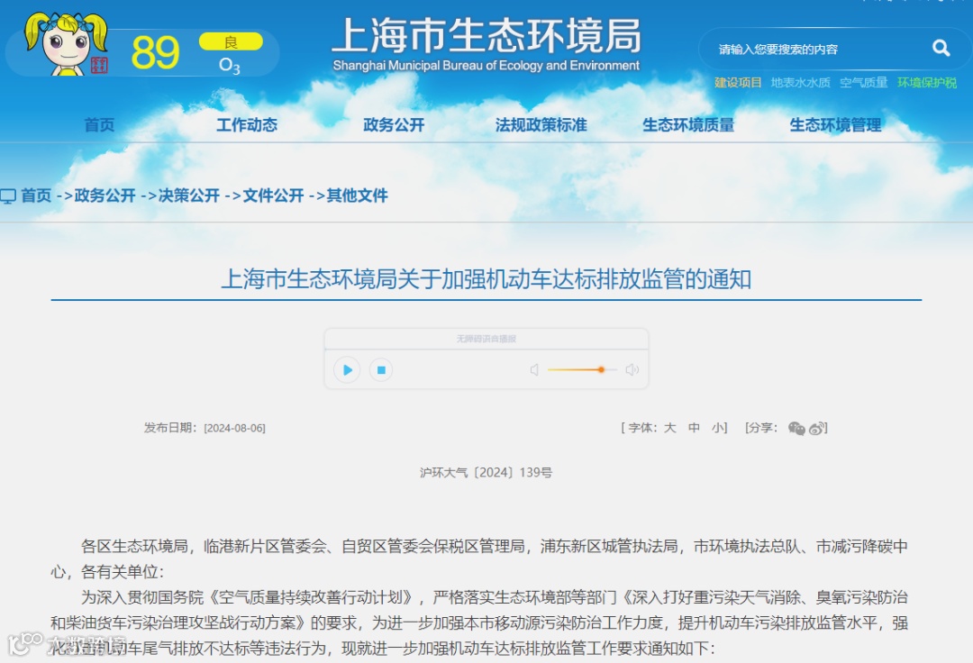 近日,上海市生态环境局发布《关于加强机动车达标排放监管的通知》,要求进一步加强机动车达标排放监管工作,将国四以及未安装远程在线监控系统的国五排放标准营运重型柴油车辆等作为重点监管对象。各区生态环境部门将以集中停放地周边道路为重点开展联合检查,每月至少开展一次路查路检工作,各区全年至少完成1000辆次机动车拦截检测,严格查验车辆污染物控制装置、车载诊断系统(OBD)运行情况、车用尿素使用情况,严厉打击排放不达标车辆上路行驶、高排放车辆违反限行规定等违法行为。