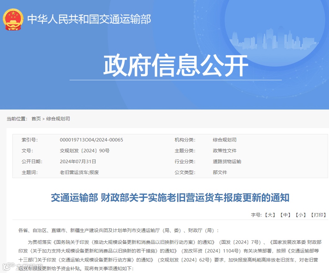 近日,交通运输部、财政部发布《关于实施老旧营运货车报废更新的通知》。本次细则明确对提前报废国三及以下排放标准营运柴油货车、提前报废并新购国六排放标准货车或新能源货车、仅新购符合条件的新能源货车,分档予以补贴,最高可补14万!补贴政策实施期限为本文件印发之日至2024年12月31日。