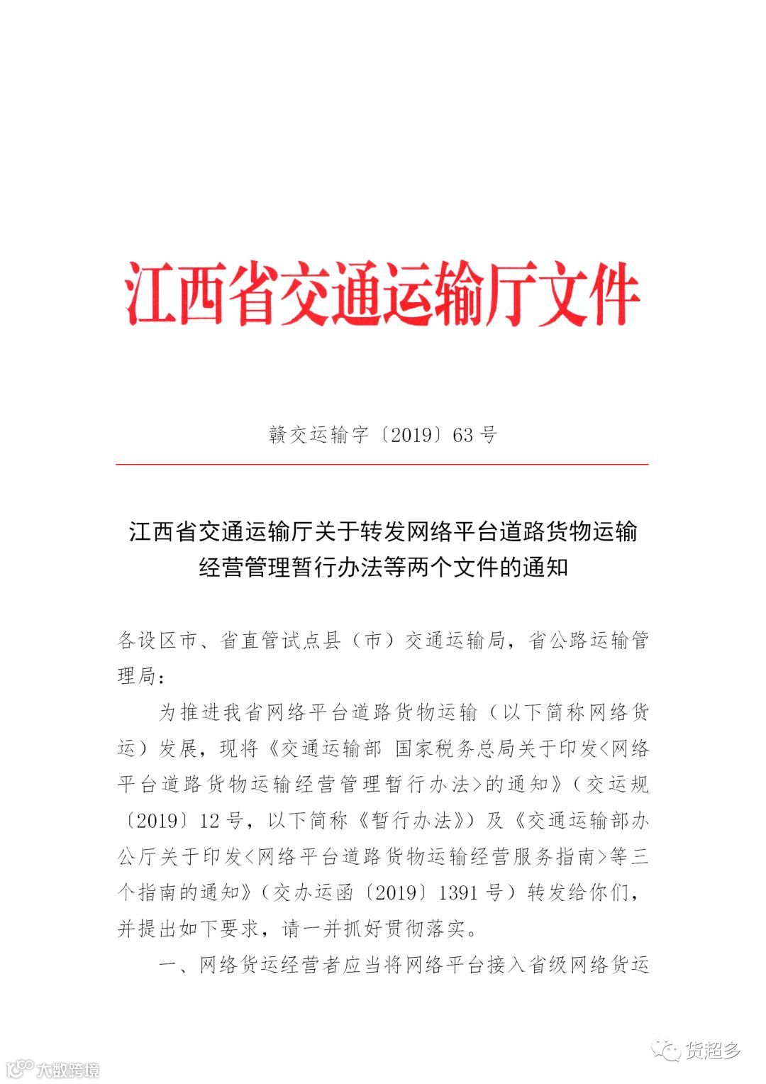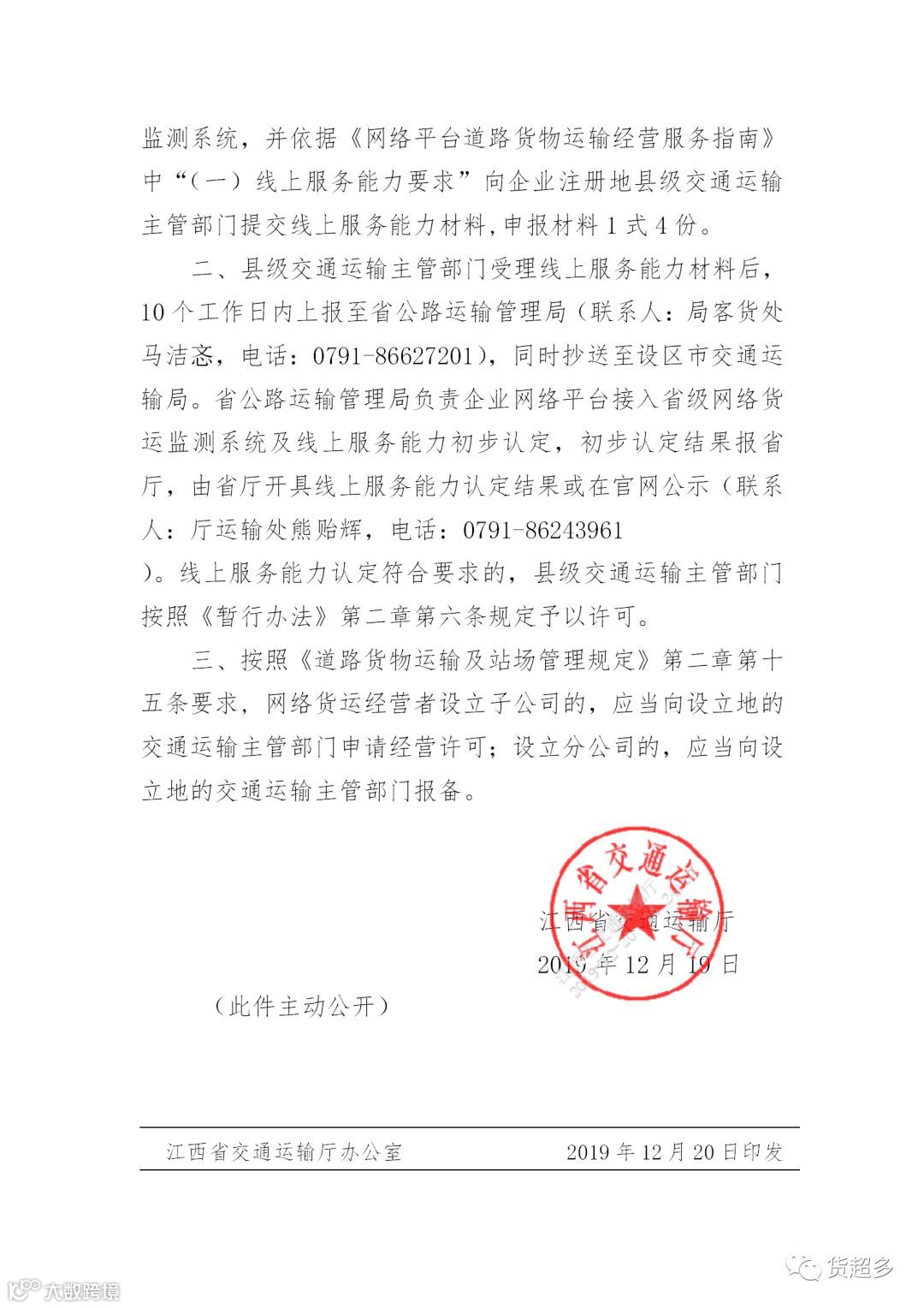 2019年12月20日,江西省交通运输厅关于转发网络平台道路货物运输经营管理暂行办法等两个文件的通知如下。