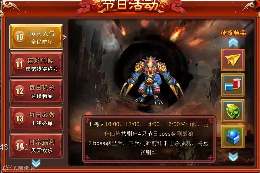 ◆每天10:00、12:00、14:00、16:00在仙都、昆仑仙境刷新节日Boss金刚战狼