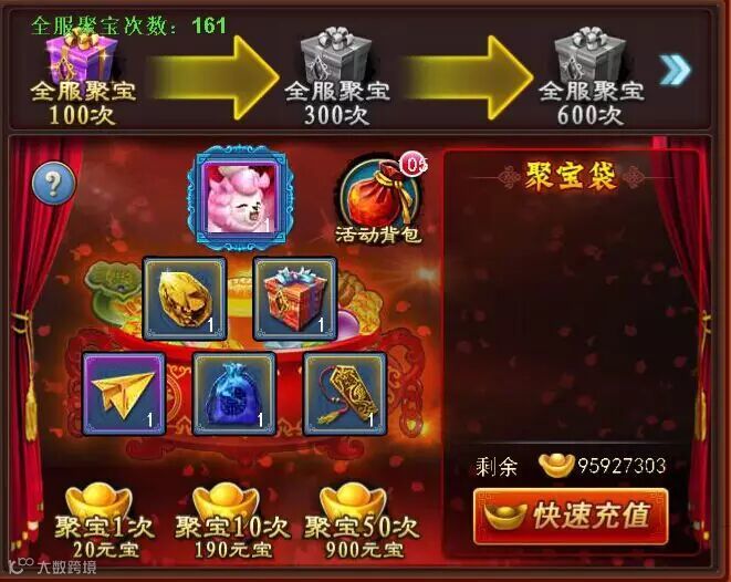 ◆全服寻宝达到一定次数,所有35级以上玩家都可领取对应的全服礼包