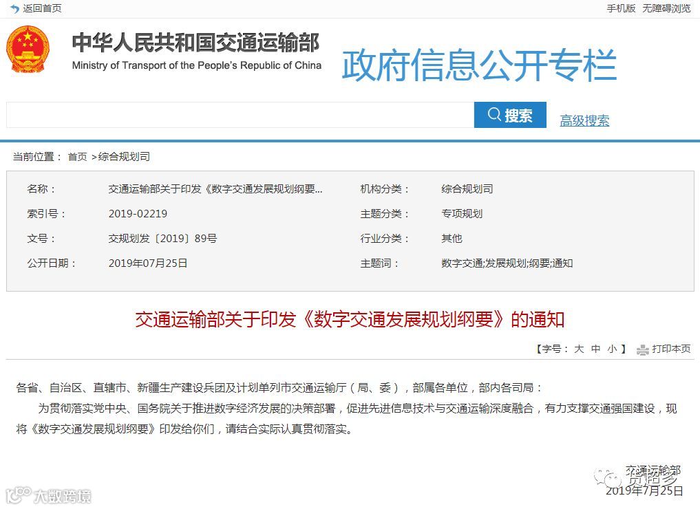 交通运输部于7月25日,发布了关于印发《数字交通发展规划纲要》的通知(下面简称“通知”)。通知中的指导思想明确指出,以“数据链”为主线,构建数字化的采集体系、网络化的传输体系和智能化的应用体系,加快交通运输信息化向数字化、网络化、智能化发展,为交通强国建设提供支撑。