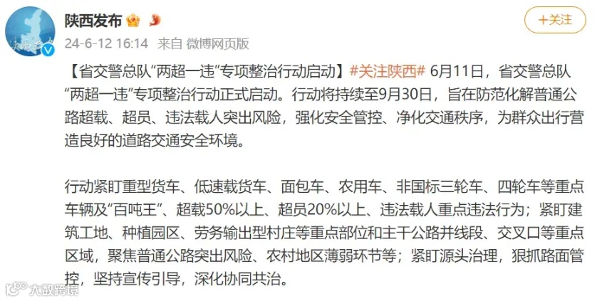 6月11日,陕西省交警总队“两超一违”专项整治行动正式启动。行动将持续至9月30日,旨在防范化解普通公路超载、超员、违法载人突出风险。