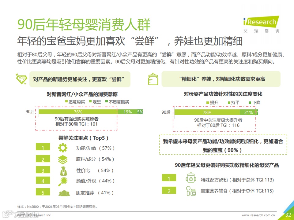 90后父母相较于老一辈的经验之谈,他们更加崇尚科学养娃,会综合各方面的信息生成自己的判断。而且更舍得给孩子花钱,有更强的消费力和更高的消费意愿,对产品的新趋势也更加关注,喜欢“尝鲜”,对功效更“精细化”的养娃产品需求较高。