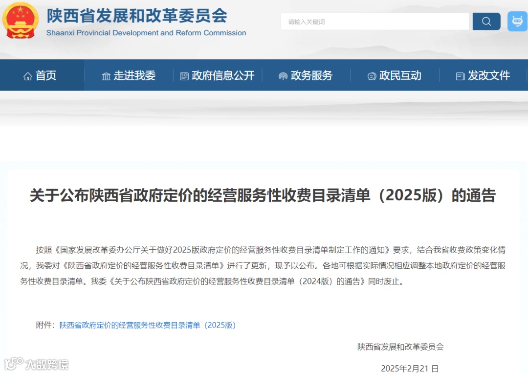 2月21日,陕西省发展和改革委员会公布了新版《陕西省政府定价的经营服务性收费目录清单》,涉及交通服务收费、公用事业服务收费以及其他特定服务收费。