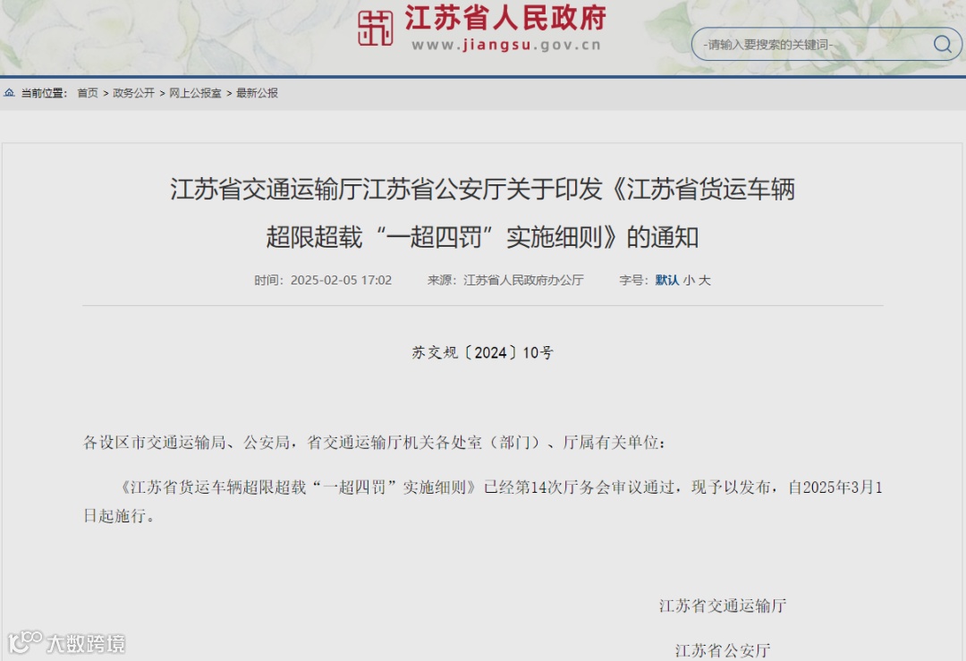 省交通运输厅、省公安厅联合修订印发《江苏省货运车辆超限超载“一超四罚”实施细则》(以下称《细则》),将于2025年3月1日起施行。《细则》的修订和实施,旨在进一步规范货运车辆超限超载“一超四罚”工作,提升依法治理水平,促进江苏省道路货运市场健康有序发展。
