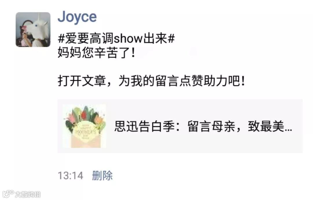 第二步:转发文章并配文 “#爱要高调Show出来# +对妈妈的留言+打开文章,为我的留言点赞助力吧!”;