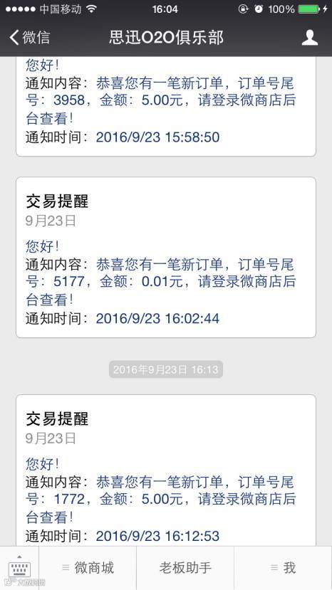 1. 顾客在微商店生成订单或助手出现异常,管理者实时收到微信推送订单及异常通知
