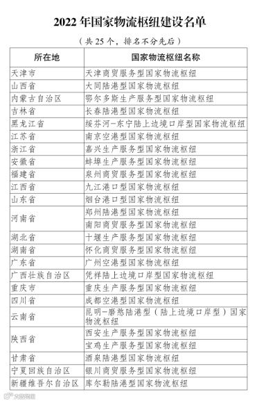 为认真贯彻落实党的二十大精神,按照“十四五”规划《纲要》关于“推进120个左右国家物流枢纽建设”的决策部署,近日国家发展改革委印发《关于做好2022年国家物流枢纽建设工作的通知》,将天津商贸服务型等25个国家物流枢纽纳入2022年度建设名单。其中,从地区分布看,东部地区6个、中部地区7个、西部地区10个、东北地区2个;从枢纽类型看,陆港型5个、空港型3个、港口型2个、生产服务型7个、商贸服务型5个、陆上边境口岸型2个、陆港型及陆上边境口岸型合并建设1个。