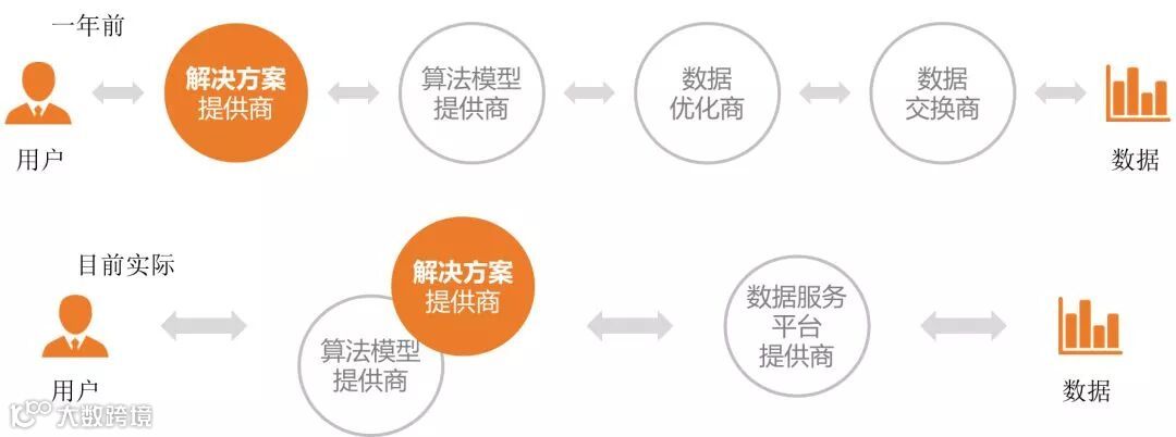 通过过去一年的观察发现,虽然市场上确实以这两种角色为主体,但在具体项目中,这二者并没有形成上下游产业链的局面。在一些行业市场中,数据服务平台提供商向前跨越,直接面对行业客户,向他们提供其所拥有的外部数据(往往本身就拥有海量的2C数据入口,可以源源不断地生产2C数据)的粗加工产品(如用户的标签数据等);而在另一部分行业市场中,数据解决方案提供商,基本使用用户自身的数据,通过数据处理服务,为行业客户提供某个方向的解决方案。在2017年初的时候,根据产业的发展我将2016年认为的产业链中四个环节压缩至了两个,即数据服务平台提供商和数据解决方案提供商。