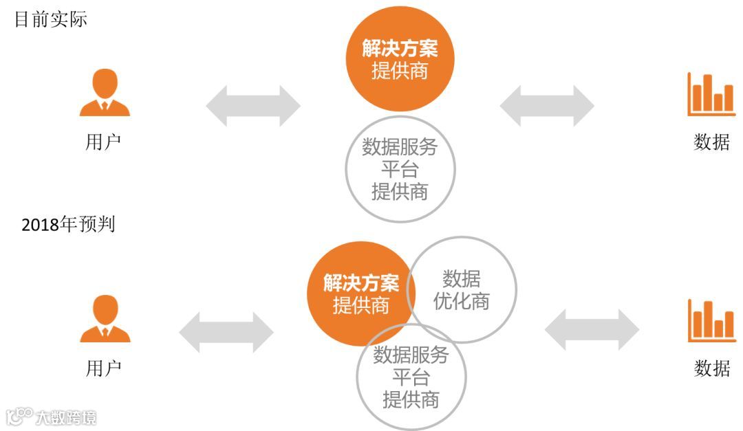 上图的上半段就是现在实际的产业链情况,而下半段是根据现在市场发展的态势。我认为2018年可能会出现的演进。随着大数据被应用到各行各业,大多数行业的数据准备并不充分,数据基础薄弱。要想使数据产生价值,发挥更大的作用,势必需要大量的数据归集与治理,这就是数据优化商的角色。由于增量市场的出现,仅靠现有的解决方案提供商和数据服务平台提供商自身的力量是不够的,这就为独立的第三方数据优化商出现,并存在创造了客观上的空间。所以说,对于大多数行业而言,要想充分发挥数据的价值,首先要从数据的归集与治理开始,磨刀不误砍柴工!