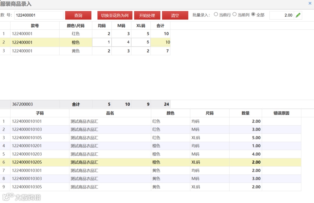 采购、入库等单据可按花色尺码直接录入,且支持批量修改数量,操作效率提升30%。