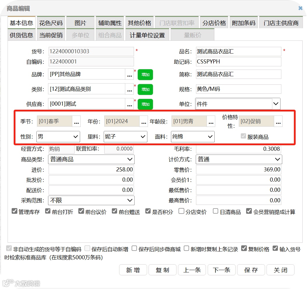支持在商品档案中维护服装属性(如材质、季节、风格等),勾选预设“花色尺码组”可自动批量生成子码信息(子码=货号,款号=自编码),快速应对多规格商品上架需求。