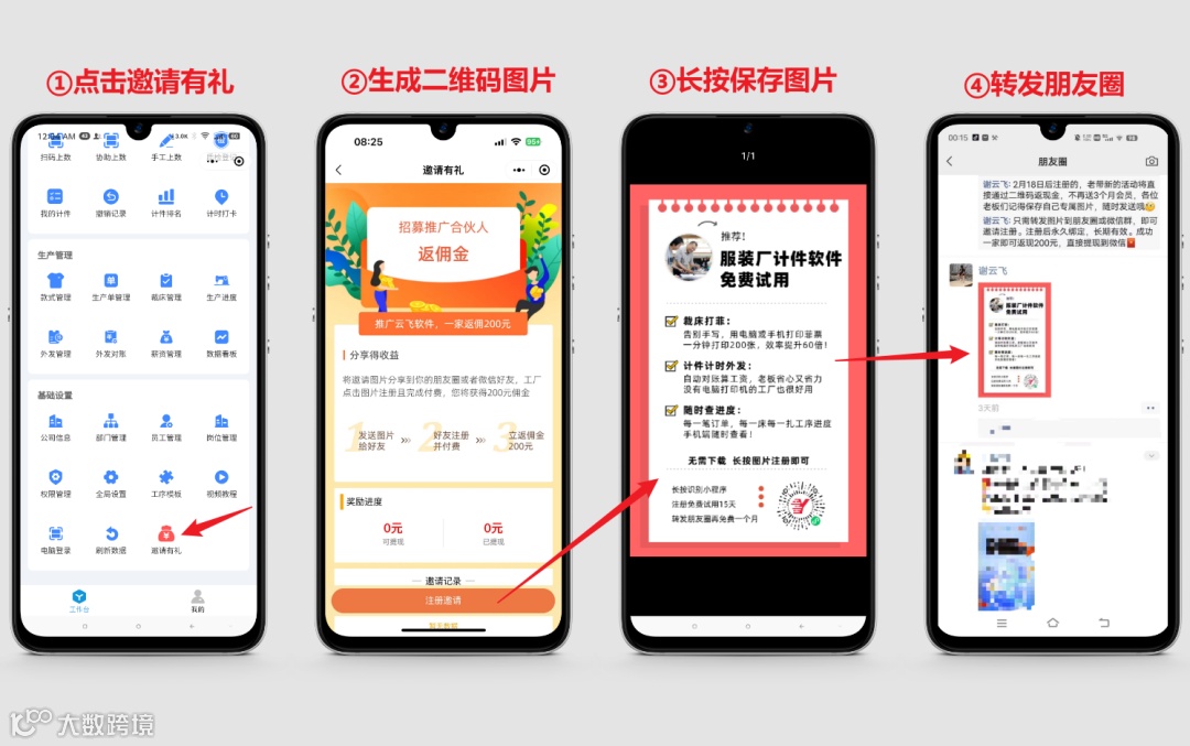 云飞智造邀请有礼上线啦~所有工厂都可参与,转发朋友圈即送一个月会员,邀请成功每家再返佣金200元!