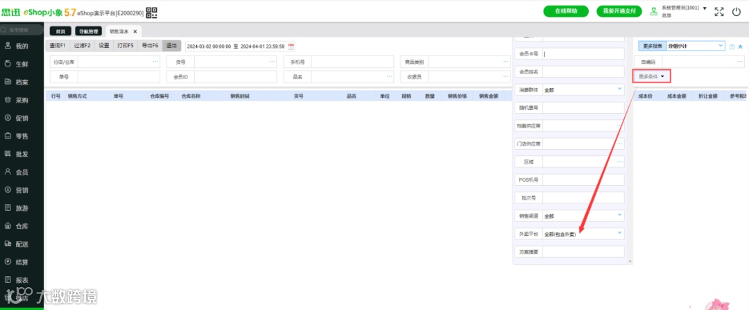 eShop小象升级了销售流水功能,我们特别针对外卖平台进行了精细化区分。商家能轻松查看每个外卖平台的订单数量、销售额、客单价等关键数据,更清晰地掌握各外卖平台的销售情况。