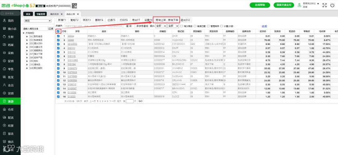 商品逐个上下架的操作过程繁琐且耗时?eShop小象现已推出全新的批量处理功能,让您轻松快速地批量上下架商品。(商品档案设置—开启选择按钮—选中商品后直接批量上下架处理)