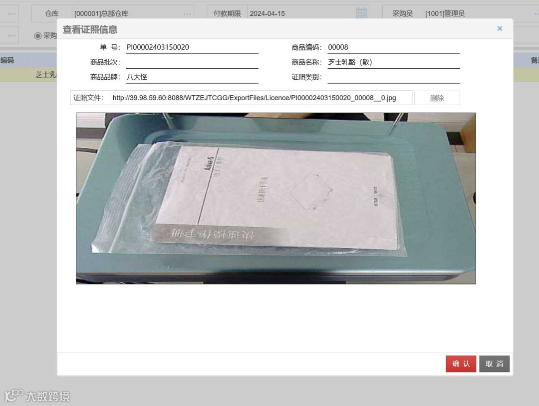 入库耗损成本高?此功能通过AI智能识别商品信息,同时拍摄实物照片记录;记录下来的信息与单据图片将统一存储在后台,商家可通过查看证照信息,精准监控库存变化及时发现异常行为。