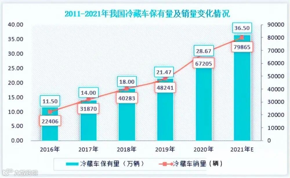 冷藏车情况来看,近六年来我国冷藏车销量及保有量也均呈现逐年递增态势。根据数据显示,2016年我国冷藏车销售量约为22406辆:到2021年年底便增长至79865辆。冷藏车保有量来看,2016年其保有量约为11.5万辆:到2020年年底便增长至28.67万辆,初步测算,预计2021年其保有量将增长至36.5万辆。