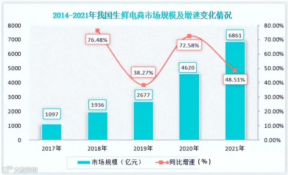 我国冷链物流行业下游端来看,近些年来,随着我国居民收入水平的稳步增长,消费水平的提高,人们对于食品的多样性、营养性、新鲜度、口感需求也大幅提升。同时,随着国内电商的发展,生鲜电商、蔬果宅配等业务不断扩大。我国生鲜电商市场来看,近五年来,从2017年到2021年我国生鲜电商市场规模已经从1097亿元增长至6861亿元。国内生鲜电商市场规模的扩大推动着我国食品领域对冷链物流需求量的不断增加。