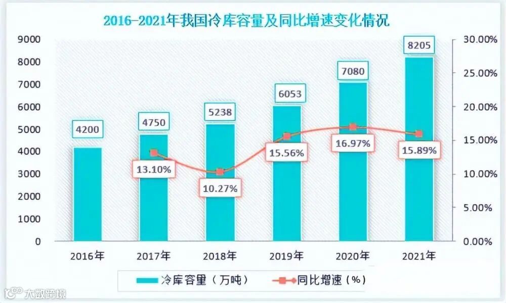 从我国冷链物流行业产业链上游端来看,尽管我国冷链物流行业发展起步较晚,其上游基础设施落后于发达国家,但是近些年来随着行业经济、政策、社会环境的利好,行业上游基础设施正在不断完善.以堪称冷链物流的“根据地”的冷库情况来看,近六年来我国冷库建设取得明显成绩。据数据显示,从2016年到2021年我国冷库容量逐年递增,且每年同比增速均维持在10%以上,2016年我国冷库容量约为4200万吨;到2021年我国冷库容量达8205万吨,较2020年同比增长15.9%。