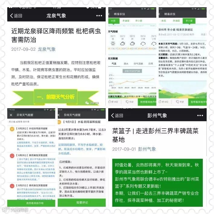 在成都市气象局的牵头组织下,我司联合成都市农气中心及各区县气象局,进行了全市农业气象服务产品梳理工作,在9月中下旬,将实现我司社会化服务产品(包括精准农技、异常天气提醒、农气专题等)全面推送至成都气象APP、成都气象微信、微博以及信息推送大屏。同时,我司将协助农气中心和各区县气象局将部分决策性产品转化成面向公众,具有可读性、趣味性,图文并茂的产品。