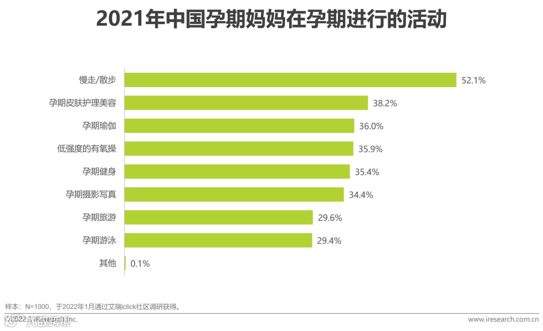 根据艾瑞调研数据,除营养品外,购买孕妇服装、产后服装、孕妇护肤品/彩妆等产品的孕妈占比均超过了20%。38.2%的孕妈坚持在孕期做皮肤护理,也有35%左右的孕妈坚持在孕期做瑜伽、健身来保持身材。