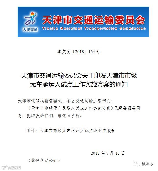 据了解,天津市交通运输委员会发布了关于印发天津市市级无车承运人试点工作实施方案的通知,竞争向来激烈的无车承运人资质申请,在申请上可一直都是宜早不宜迟的哟~